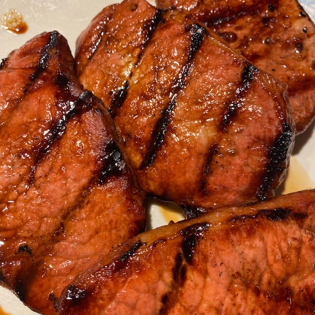 Drain the chops and pat dry, discarding the marinade. Grill on high 4-5 minutes each side, or until an instant-read thermometer reads 150F internal temperature. Don’t move them around while grilling—the sugar in the marinade means you’ll get beautiful grill marks if you just let them be.