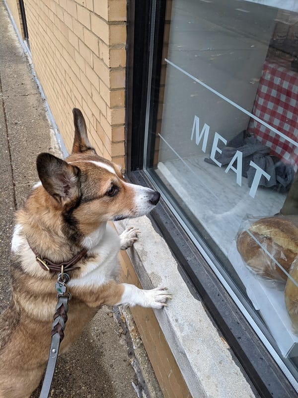In early December I was called to watch Winston just for the weekend and we went on an epic walk to get a breakfast biscuit. He and I couldn't get inside, natch, but we sent Joey in to save our hungry souls and I snapped this pic that I think sums up the situation perfectly. Shout out to the best breakfast sandwiches in the neighborhood, L&M Fine Foods. I know you have a soft spot for corgis.