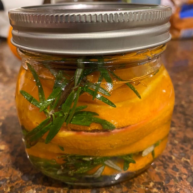 Layer the sliced oranges and rosemary in a jar with a tight-fitting lid, and pour the vodka over. Seal the jar, shake well, and let sit for 3-4 days, shaking once a day. At the end of the infusion, strain through a cheesecloth and discard the fruit and herbs.