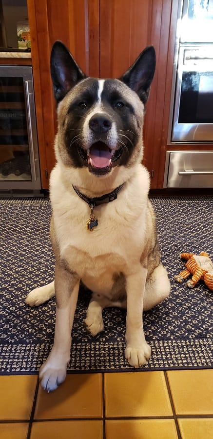 This is Boulder, our 1.5 year old, 105 pound Akita. He goes from being a highly-attentive and vocal watchdog to taking up space as a lumpy shag rug/fuzzy end table at a moment's notice. Loves walks, exploring the backyard, all kinds of toys (especially round ones he can kick like a soccer ball), receiving treats or ice cubes, and falling or drifted snow. Dislikes/is wary of most strangers, neighbors, visitors and extended family members he goes months without seeing. Indifferent toward most other dogs and the two cats with whom he shares our house.