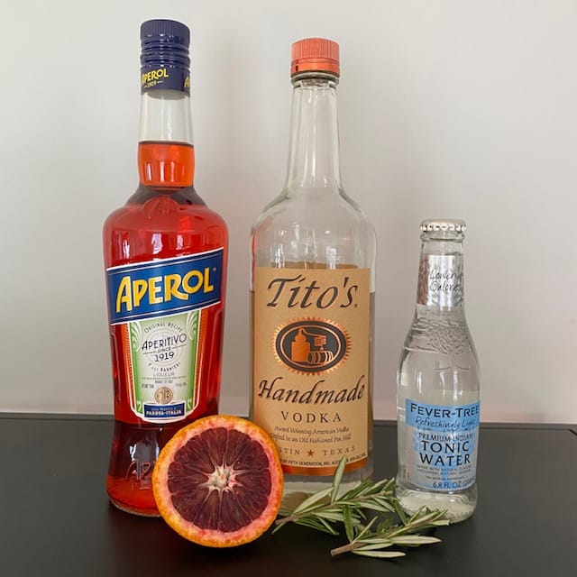 Pour the vodka, Aperol, and tonic over ice, and garnish.
