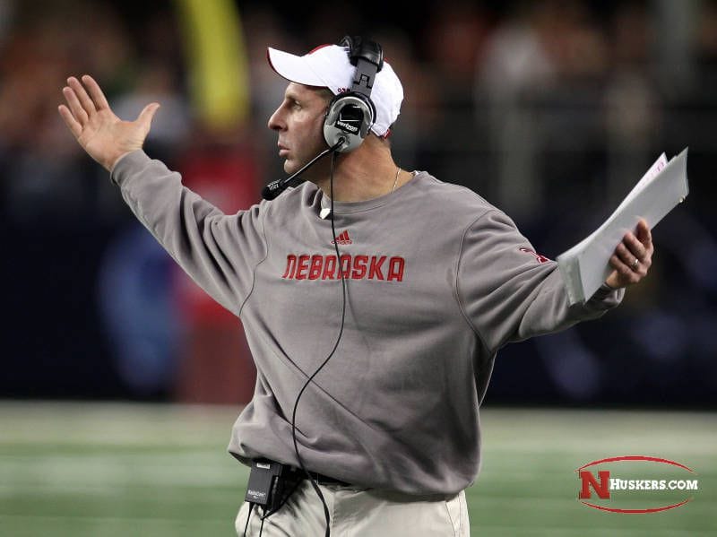 The pass lands. The clock reads 0:00. Nebraska players rush from the sideline. Coach Bo Pelini extends his arms in apparent victory, while Texas’s Mack Brown screams at the officials.