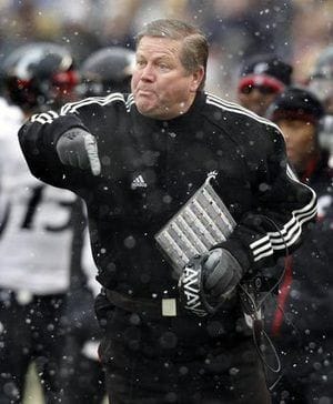 This jump coincided with a pair of inspired coaching hires. First, national title-winning defensive coordinator Mark Dantonio from Ohio State, who would lead the Bearcats to two bowl games before departing for a lengthy and successful tenure at Michigan State. Then, a largely-unknown coach from Central Michigan University: Brian Kelly. Purple-faced with passion or rage on the sideline, in his first year in Cincinnati Kelly took the Bearcats to 10 wins for the first time in over 50 years. In his second year, that improved to a school-record 11 wins and a trip to the Orange Bowl.