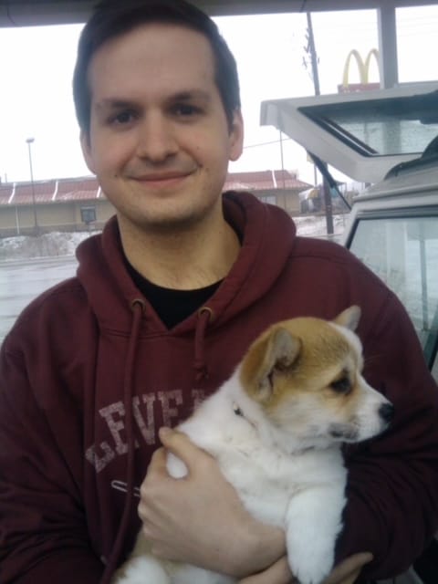 I’m standing in a McDonald’s parking lot somewhere between Akron and Brooklyn, wearing a ragged Cleveland Cavaliers hoodie that I still have and still wear. The picture quality is that of a dozen generations of iPhones ago, slightly-blurry and poorly-lit in the aesthetic of every picture I took or had taken of me back then. Holly—about an hour into her new life with us—cuddles against me, looking around curiously.