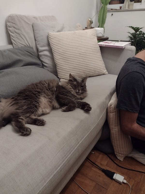 This is Lito, my friend Bruno's cat. Since being vaccinated, I have rebuilt my relationships with my friends' pets (they usually don't care for Zoom calls). Lito is the most affectionate cat I've ever known. He likes giving me eskimo kisses and loves just sitting on laps, waiting to be petted. I took this pic because It looks like he's winking at me.