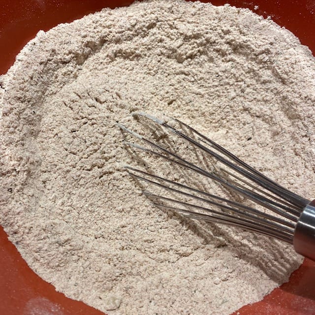 Whisk all the dry ingredients together; you’ll find the flour takes on a distinctly “spiced” appearance, as there’s a heavy amount of seasoning in it relative to many other chicken recipes.
