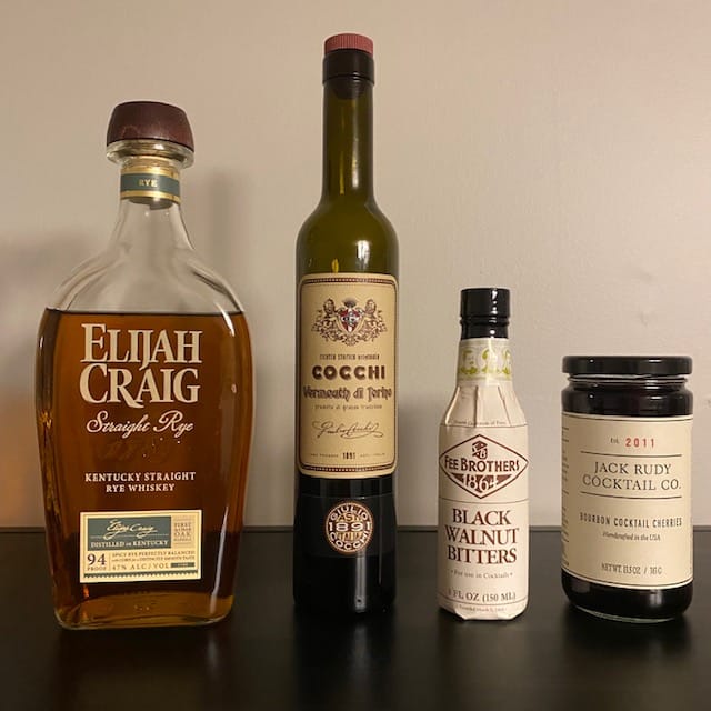 I used nicer ingredients here, but Mike swore the only part worth spending money on was the cherries; good, dark, real cocktail cherries, Luxardo or Jack Rudy or the like, “not those bright-red clown-nose ones, they’ll ruin it”.