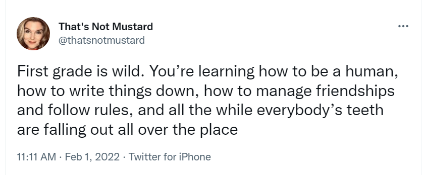 Childhood is a time of wonder, but it’s also a time of constant confusion, overwhelming emotion and lack of control over one’s life. This tweet came across my feed a couple months ago, and I swear I’ve thought of it nearly every day since, as it perfectly encapsulates my children’s current reality, right down to the tooth I have to remember to fish out from under a pillow after I finish writing tonight: