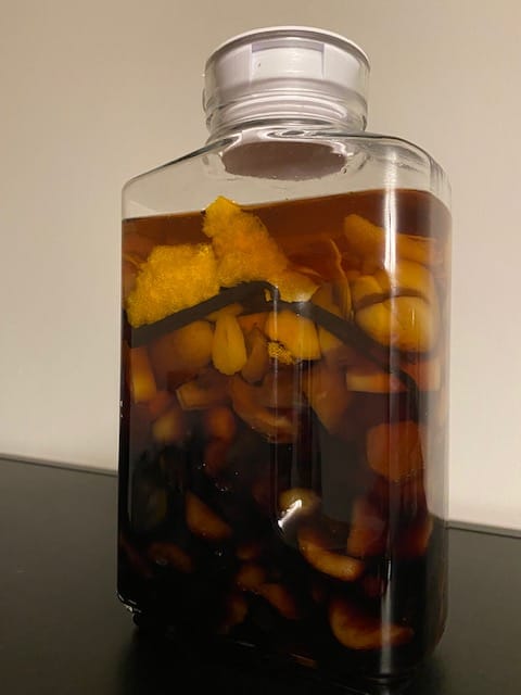 Now, these proportions are imprecise. I happened to have roughly those amounts of brandy, bourbon and rum in lower-shelf bottles that I didn’t mind mixing, so that’s what I used, and that trinity is also the foundation of some historic drink recipes like Chatham Artillery Punch. But, this is about clearing out the 2021 stock; use whatever dregs of brown liquor is available to you. Similar on the fruit; I bought those because I like those, but adjust to your sensibilities.