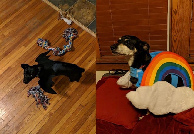 Dogs in costumes: This is Julius, giving my wife and I the side-eye as we try to recreate Matt Berry saying "Bat!”, and Callie, being a regal rainbow.