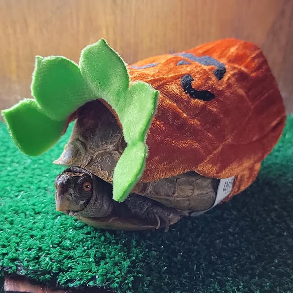 For the newsletter, Halloween Pets Edition, I present my niece’s turtle, Turtle, in his pumpkin costume. He may be outraged, he may be mellow, no one can tell. This is his all-purpose facial expression.
