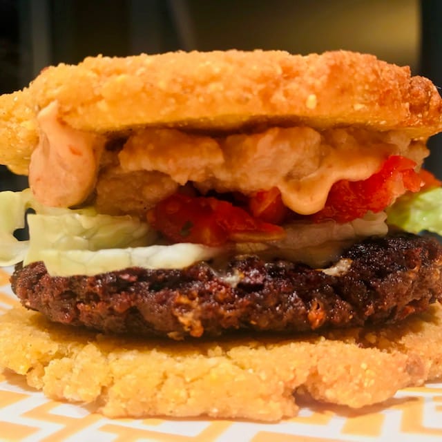 Now, the normal step from here would be to top with beans, salsa, cheese, shredded lettuce, etc. But I never do anything normally, do I? Of course not. I’m making these into burgers, and I want something that’ll stand-up, flavor-wise.