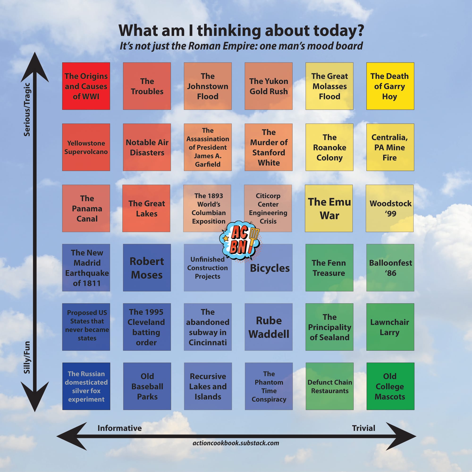 It’s a matrix of the things I’m thinking about plotted on two axes, one from “is this important or trivial?” and one from “is this silly or kind of tragic?”.