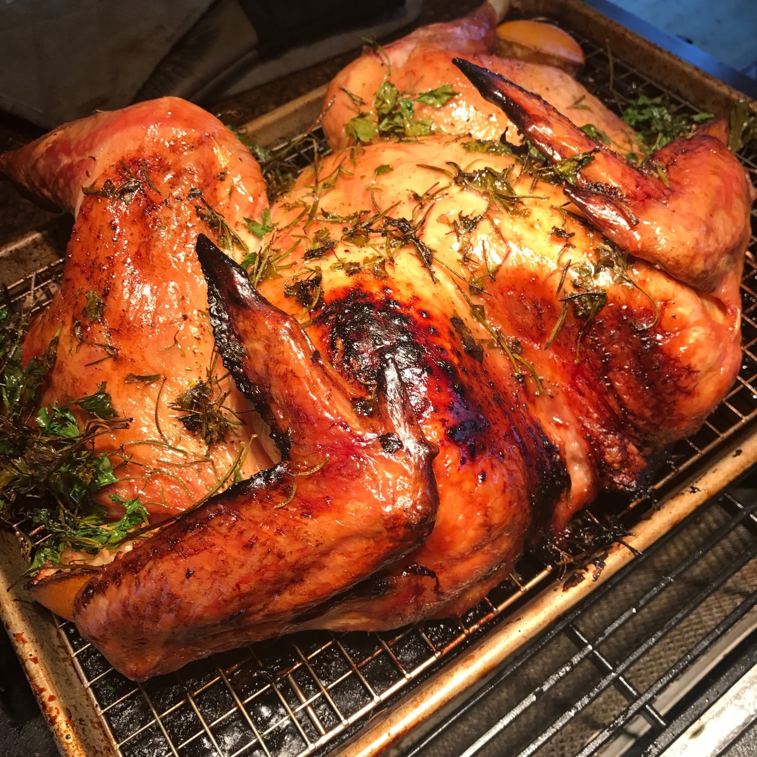This gives you a bird that’ll cook quickly and evenly. After seasoning as you like (I rub liberally with butter and herbs after a two-day dry brine), it can go on a sheet pan into the oven or, as I do it, on the grill. I’ve done a 14-pound bird in under two hours this way, without drying out at all, and without taking precious oven space away.