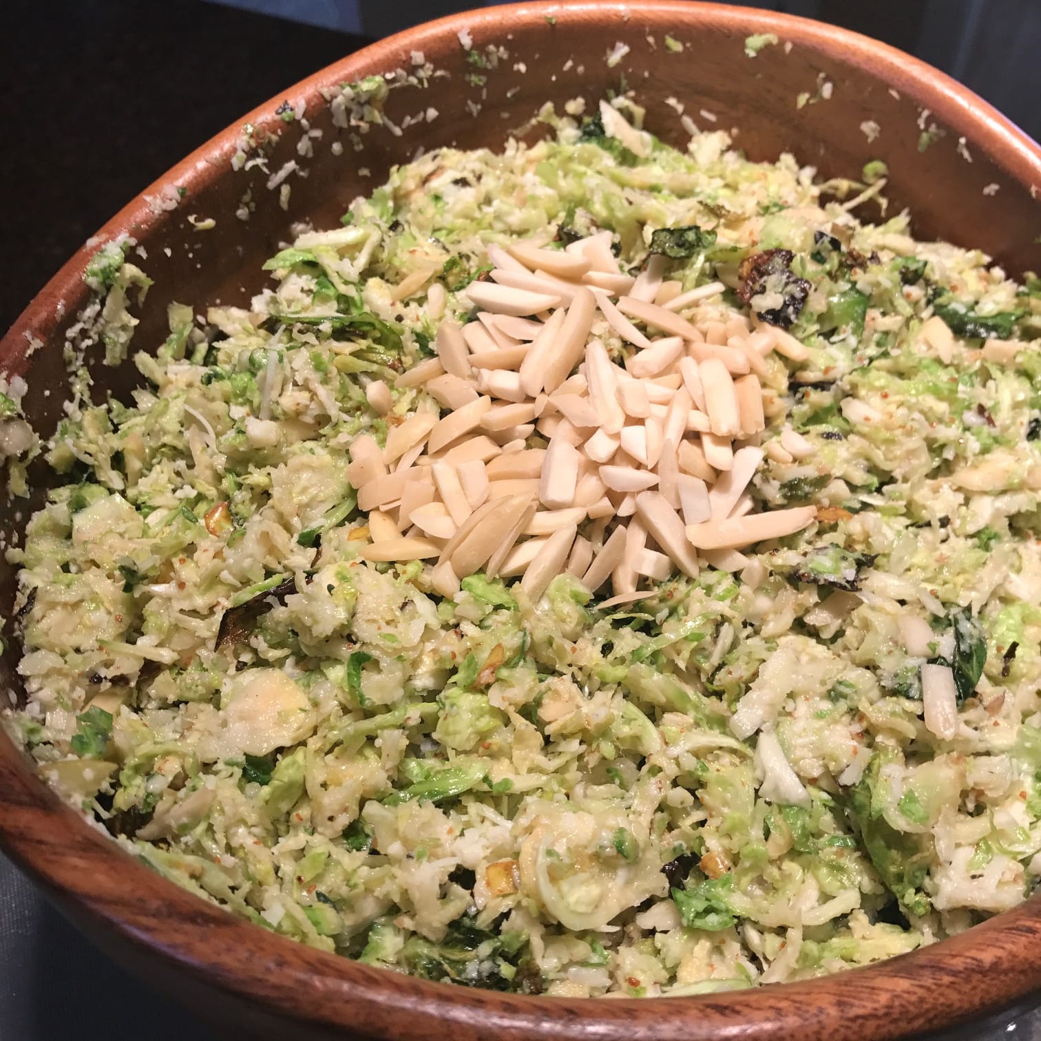 After removing the outer leaves from the sprouts, shred the sprouts on a box grater or in a food processor. (This is a great task to keep someone busy with.) Matchstick-dice the apples, and toss with the shredded sprouts, almonds and grated cheese. Whisk the vinegar, mustard and oil together, and toss with the salad. Add the bacon. Toss the reserved leaves with oil and bake on a foil-lined sheet pan for ~10-15 minutes at 450 degrees, keeping an eye on them, until crisp. Top the salad with the crispy leaves.