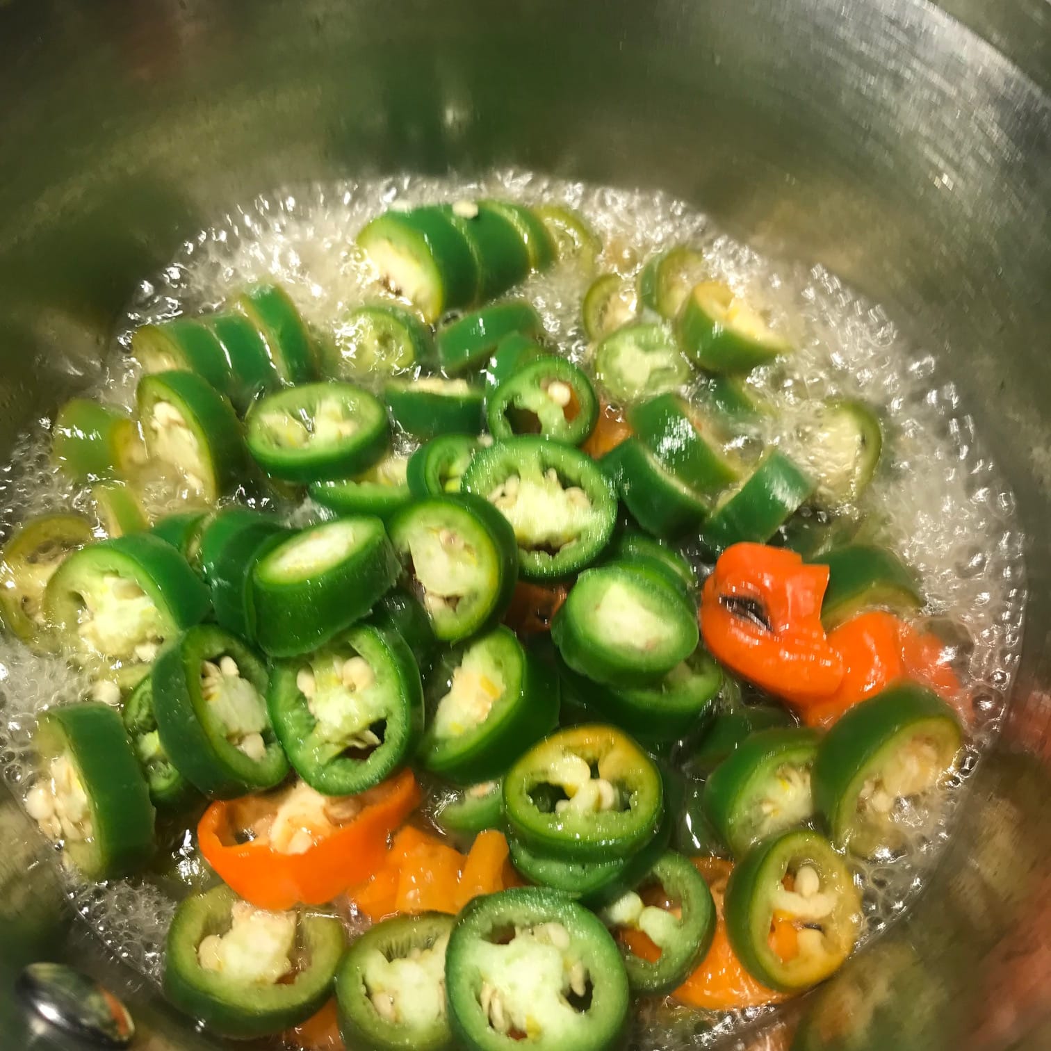 Separately, I sauteed an assortment of peppers — in my case, serranos, jalapenos and habaneros, but you could really use anything — with apple cider vinegar, garlic, and salt. (Note: do this in a well-ventilated kitchen. I neglected to turn on the fan and did sort of tear-gas the whole house. The price of greatness, I say.)