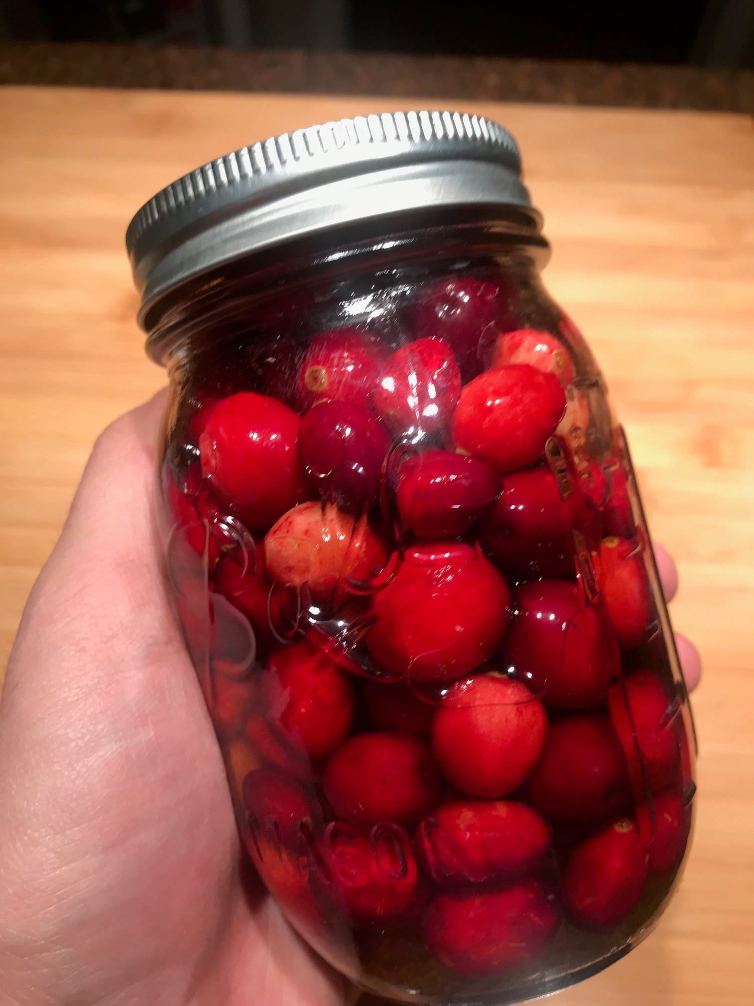 Here’s what we’re going to do. We’re going to take those cranberries, and put them in a jar with a tight-fitting lid. Pour a tablespoon or two of sugar over them. Now fill with bourbon. And wait. Today’s Friday, that’ll give you six days to infuse that bourbon with cranberry flavor. (Four should be enough, if you can’t get to it right away.)