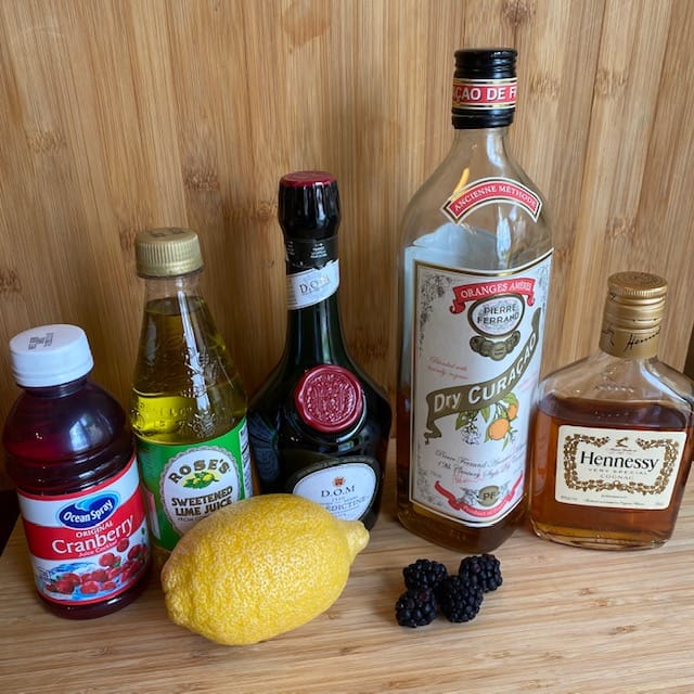 In a cocktail shaker filled with ice, shake the cognac, orange liqueur, Rose’s lime, Bénédictine, and cranberry juice vigorously, then strain into a glass filled with ice. A proper Oaks Lily is served in a stemless wine glass, but use the closest thing you’ve got. I decided to class up the joint with this vintage pressed-glass goblet. Garnish with lemon wheel and blackberry.