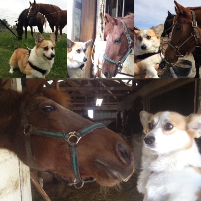 This is Holly, my corgi, meeting my mother-in-law’s saddlebred horses at various points over the years, headlined by her iconic 2013 encounter with certified good boy Elwood (bottom picture).