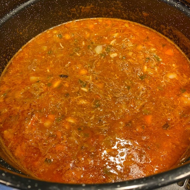 Okay, we’re back! At this point, using tongs and/or a slotted spoon, remove the meat from the broth, debone and chop, or—preferably, if you have a stand mixer—use the paddle attachment to quickly pull the meat. To the still-simmering broth, add the potatoes, cabbage, carrots, bell pepper, leeks, tomatoes, lima beans, bourbon, and pulled meats. Simmer for another two hours, stirring very occasionally.