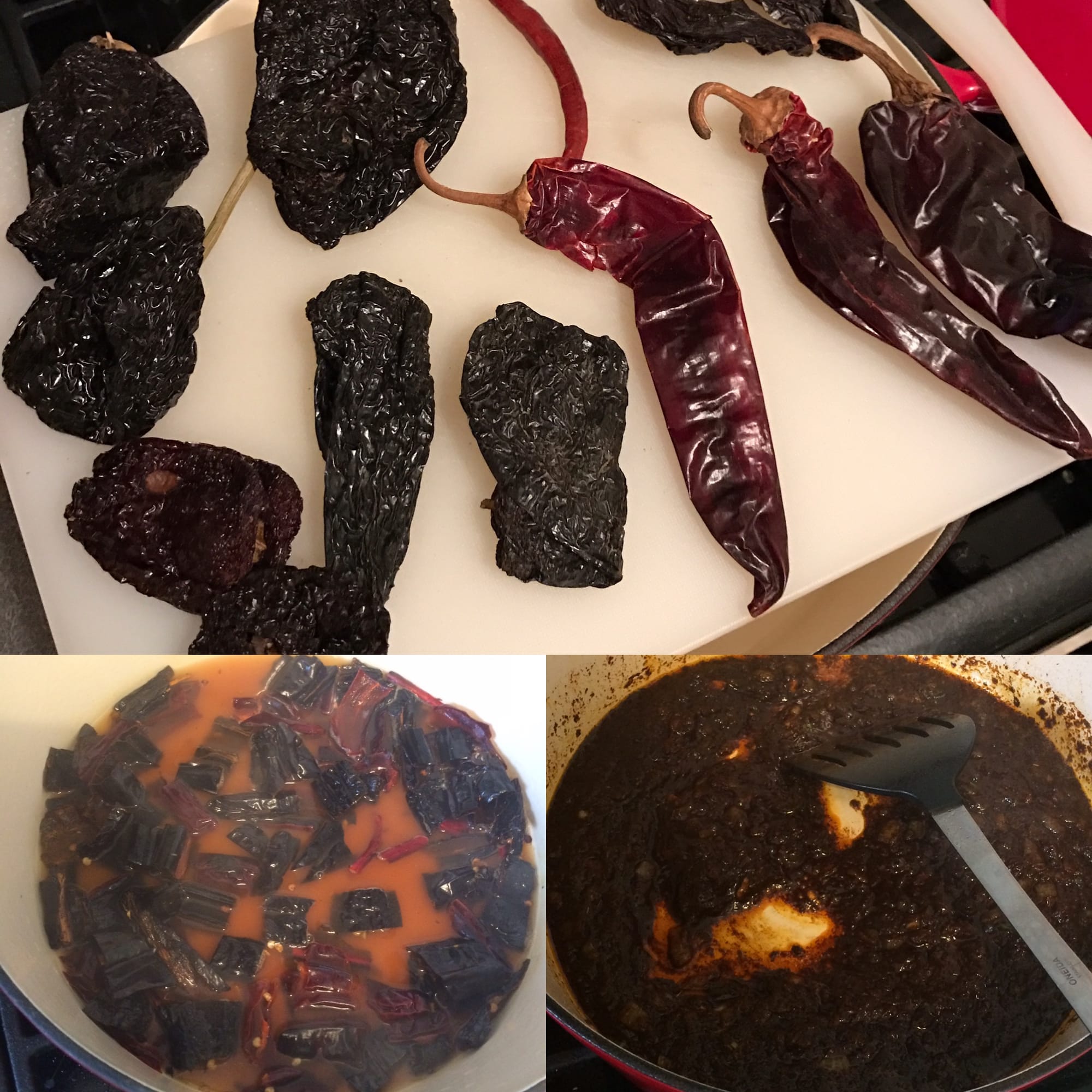 I use a mixture that changes every time (depending on what I have on hand), but generally centers on ancho, guajillo and pasilla chiles, with an arbol or two thrown in if I want it hotter. There’s no hard and fast recipe to it — grab a few kinds, experiment with what works for you. Cut them up with scissors, remove stems (and seeds, if you want to temper the heat), reconstitute in stock, and blend up to create the base:
