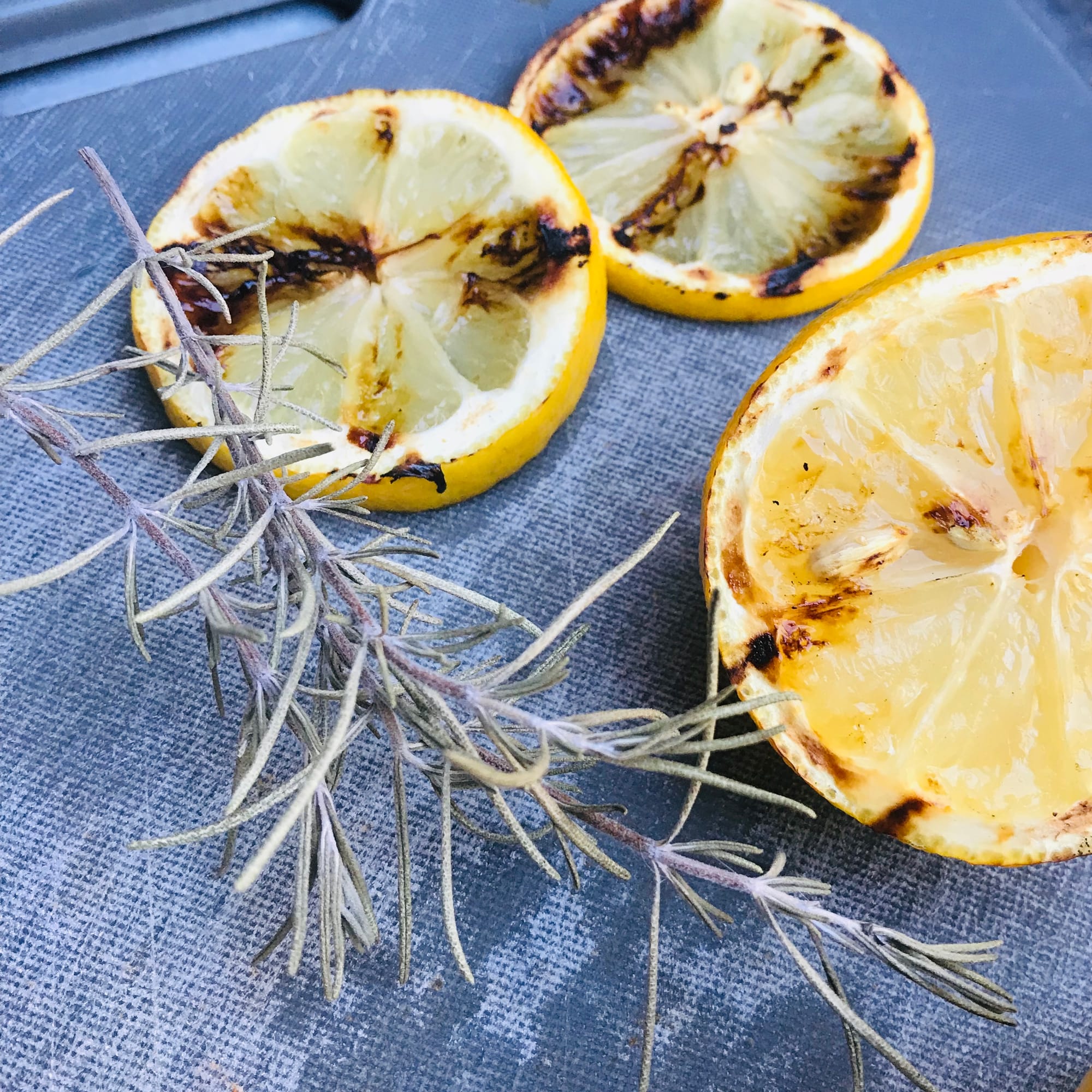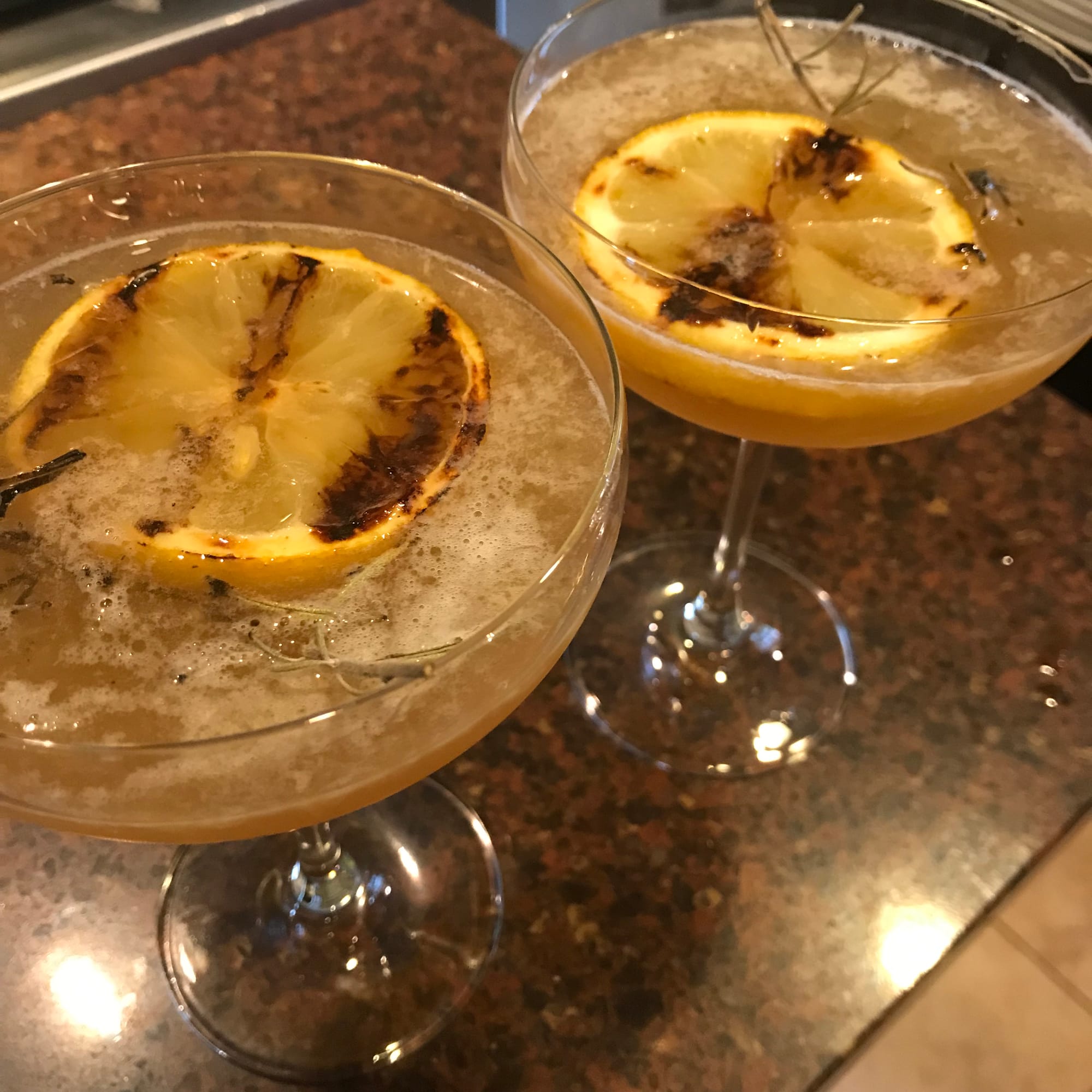 Slice the lemons in half, and slice off two wheels from those halves. Grill them all until they take some char — the book says 4-6 minutes, but it took me about ten. Juice the halves, and add 2 oz of that now-smoky lemon juice to the bourbon and honey syrup. Shake well with ice, strain, and add the rosemary and salt.