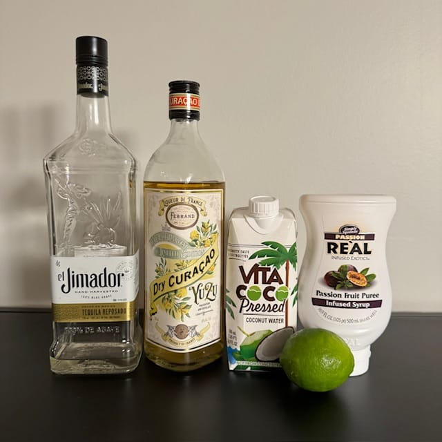 In a cocktail shaker, mix the tequila, Dry Curaçao, passionfruit syrup, and lime juice; shake well. This is a very solid margarita if you stop right here, or just add a few ounces of the coconut water. But we’re not stopping; we’re going to the pool.