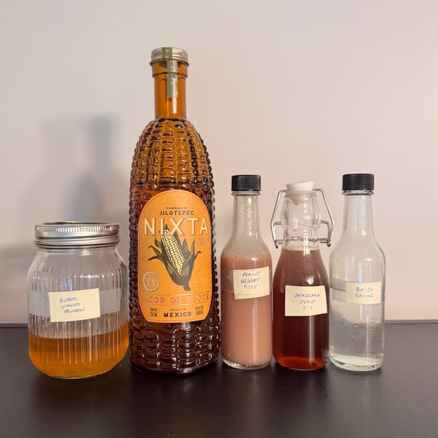 Not that I was opposed to some work, of course, but I wanted to bring it down to mortal levels. I scaled back the ambitions to a few separate potions and tinctures, including a butter-washed bourbon, a homemade peanut orgeat, a caramel-adjacent syrup, and a salty solution that’d help me hit all the key notes in a box of Cracker Jack.
