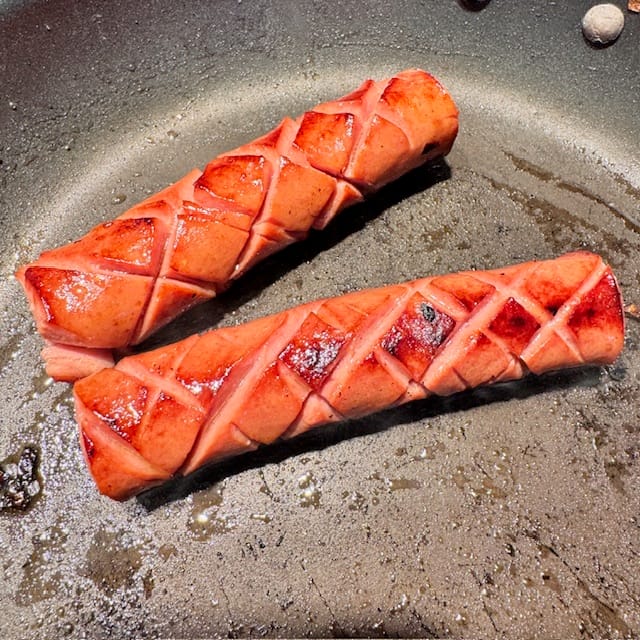 I sauteed down finely-chopped onions, adding a bit of teriyaki sauce at the end. I took a couple jumbo Nathan’s hot dogs, gave them a cross-hatch cut, and pan-seared them until crispy.