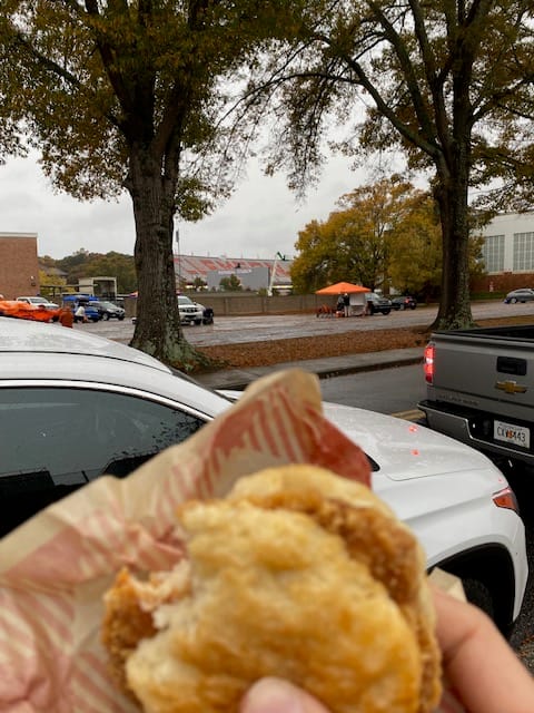 A Bojangles Chicken Biscuit in a Parking Lot in the Rain at 8am