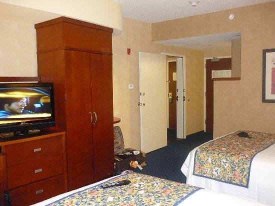 After some time of yelling and kicking, she manages to turn the bedside light on, which allows me to see that the shadow I saw was not a murderer, but instead the built-in wardrobe common in Courtyards Marriott of the era: