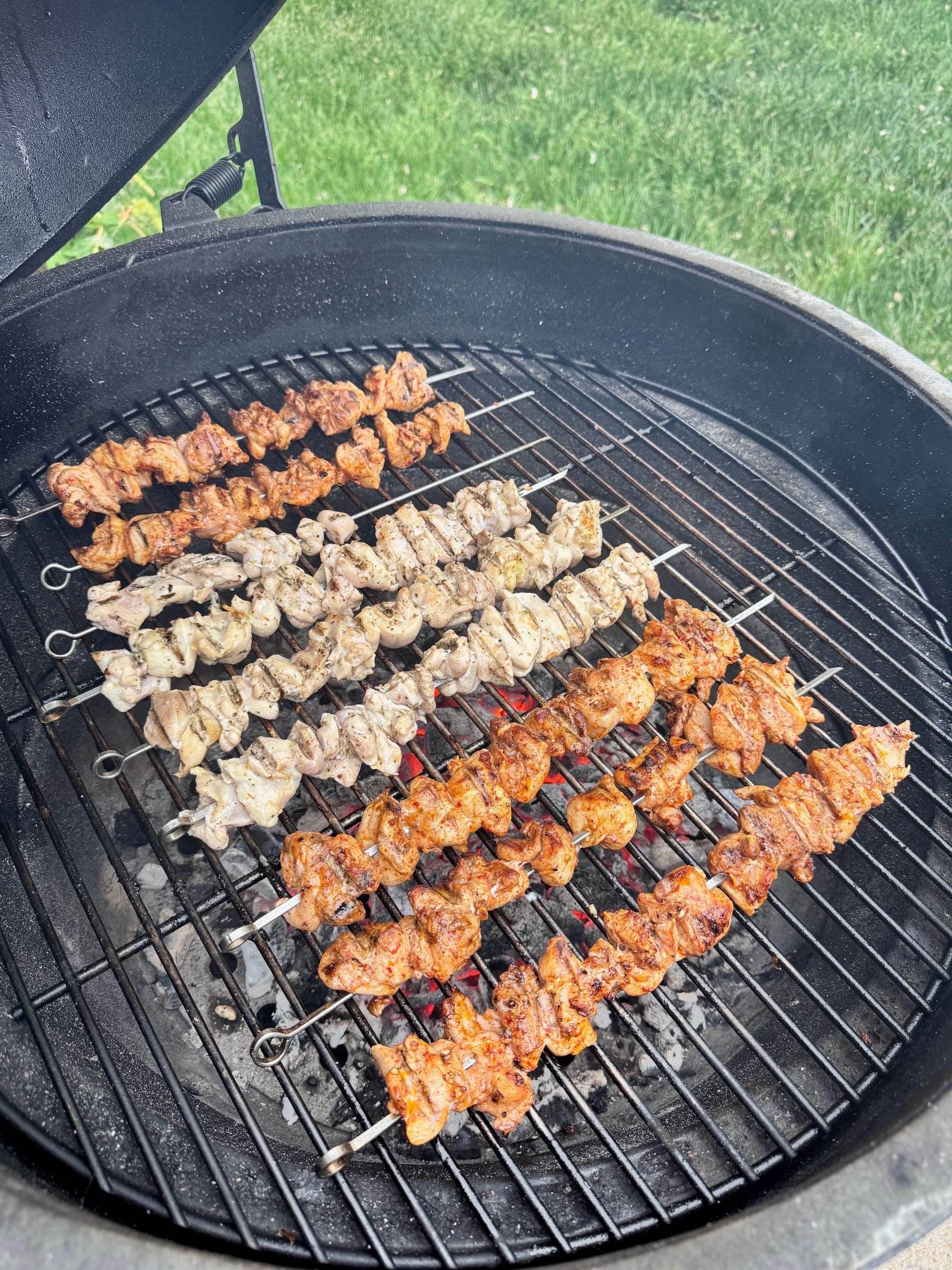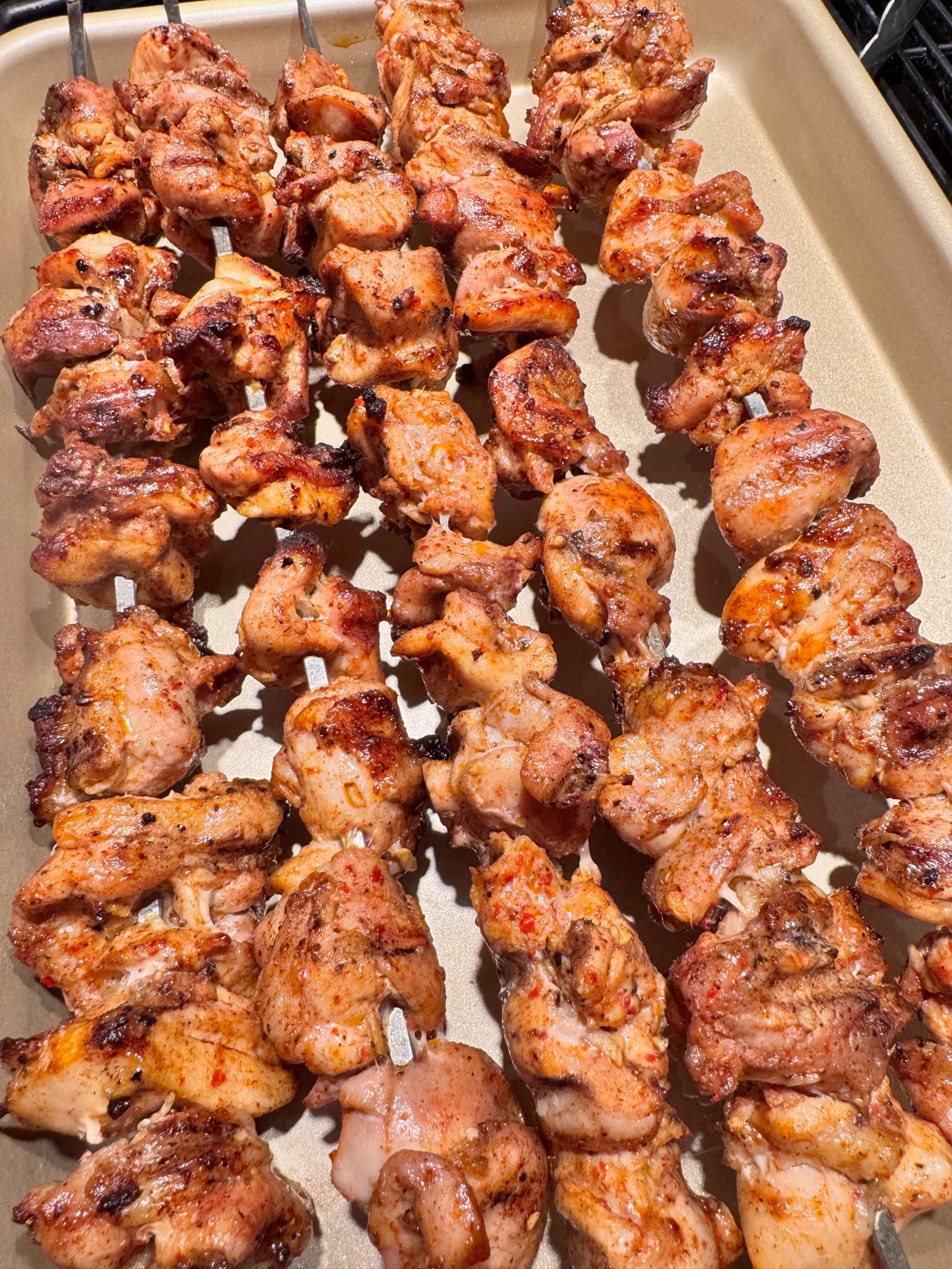 Whisk the olive oil, lemon juice, garlic, seven-spice, Aleppo pepper and salt together, then toss it with the chicken pieces, turning to coat well. Transfer to a ziplock bag and chill in the fridge for 2-4 hours. Once they've sat, thread the pieces onto metal skewers, not crowding them too much, and grill over a charcoal flame for ~5 minutes on each side.