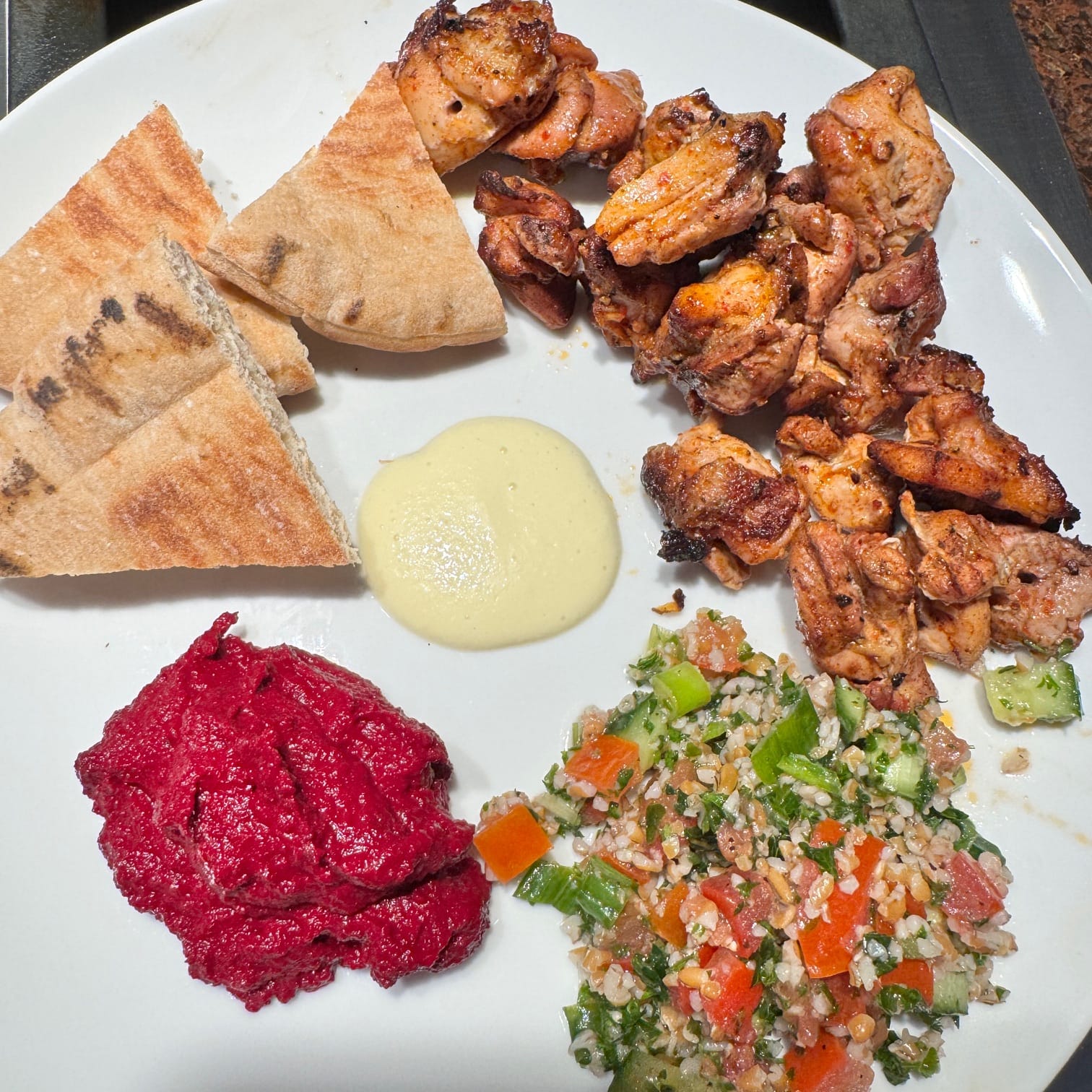 I tested out a handful of recipes last weekend, making the mütabbal shmandar (beet dip) and shish tawü (chicken kebabs). The beet dip was very tasty, but the kebabs were an unexpectedly huge hit with the whole family: I thought I was making leftovers for the week, and instead it all got eaten in one sitting.