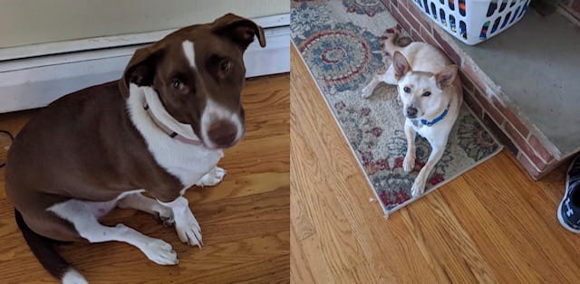 The brown dog is Zoey. She likes laying on people and licking her own butt. The tan/white dog is Blitz, who chases his tail when he gets excited and sometimes catches it.