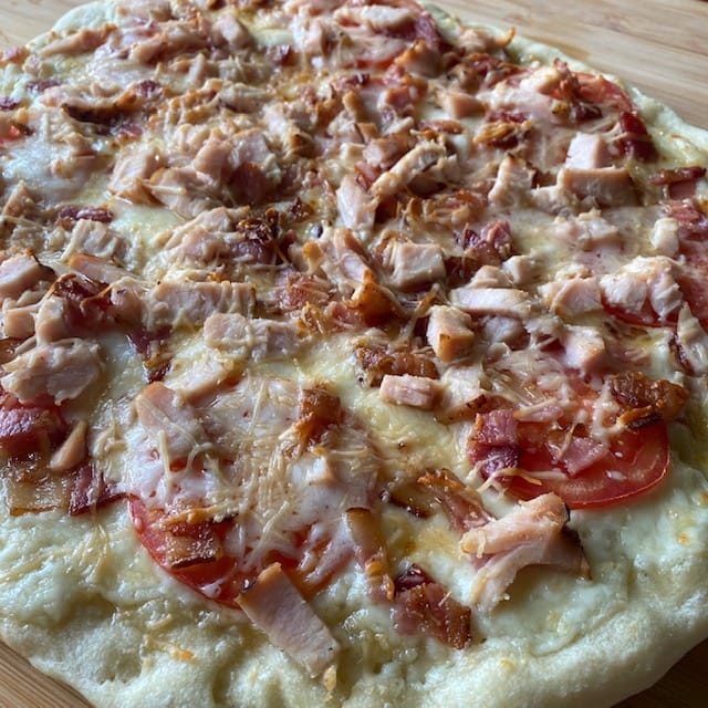 Spread the Mornay sauce over the dough; if it’s the same consistency as mine, it’ll be like frosting a cake with cheese. (Note to self: future content?) Add thin slices of tomato, then scatter the chopped bacon and turkey, and top with Parmesan. Bake until the bottom begins to brown. I use a pre-heated pizza steel in a 550-degree oven; you may not have the setup for this so it may take a bit longer.
