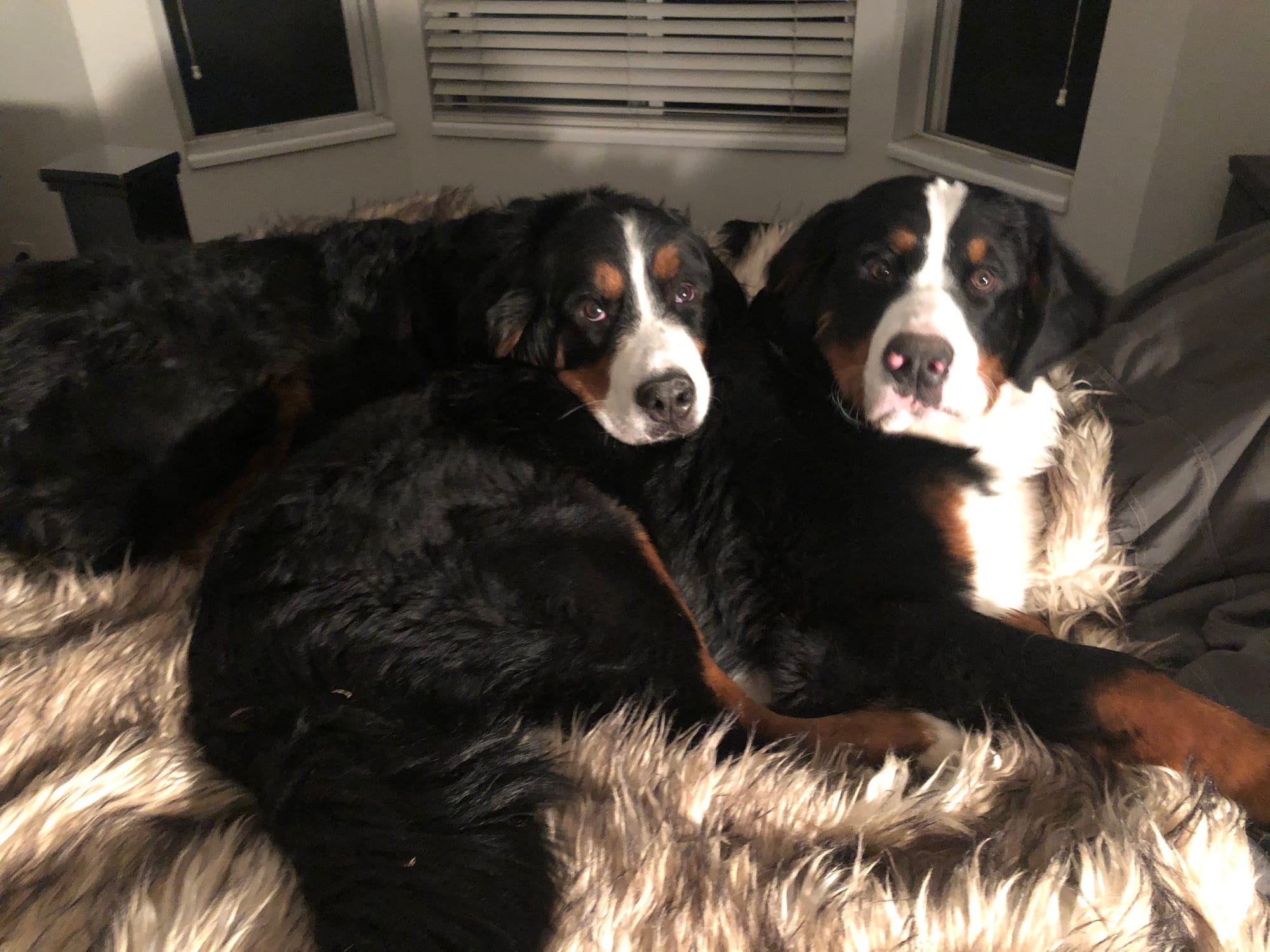 GOOD DOGS. If these big boys are territorial of your bed, I wonder where you sleep.