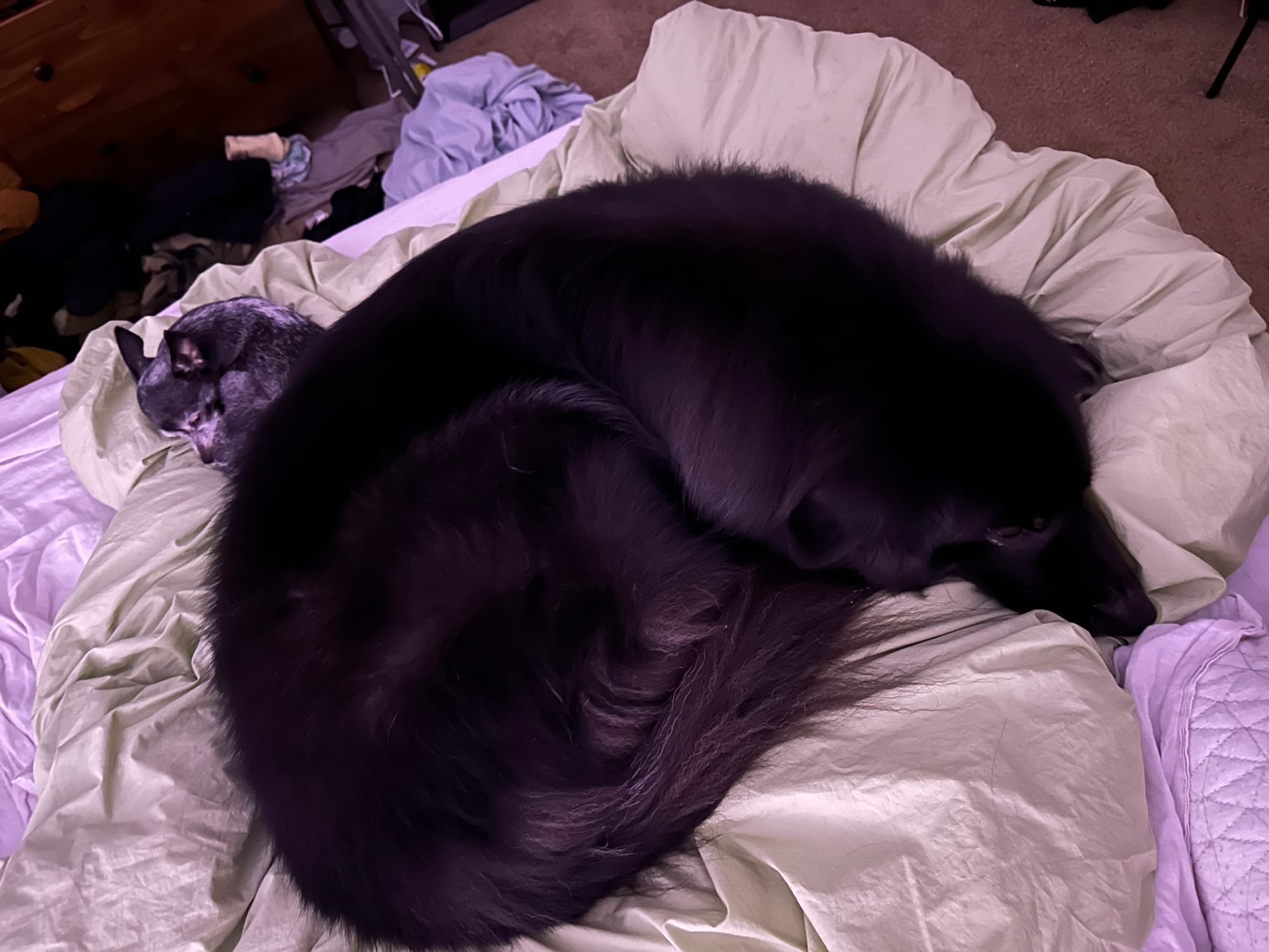 She lives with George who is 13 years old and 4 lbs. You think you know what 4 lbs feels like but he feels like less than that. George's favorite foods are green beans and his new canned kidney diet. George and Kuma are such disparate sizes it is difficult to photograph them together but I keep trying.