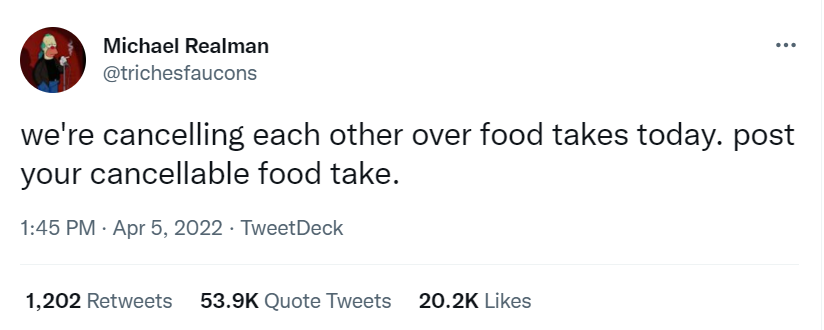 At the moment I’m writing this, that particular prompt has been quote-tweeted nearly 54,000 times by people airing their most would-be controversial opinions on food, from the inflammatory-but-pedestrian “pizza is mediocre” and “chicken wings are trash” to the truly bizarre “dipping Oreos in water is better than dipping them in milk” and “I dip my pizza crusts in Coca-Cola” to the okay-we-get-it-you’re-British “baked beans on toast is delicious”. It’ll probably be far more by the time this publishes, because if there’s one universal truism about human behavior in the year 2022, it’s that we all freaking love arguing about food.