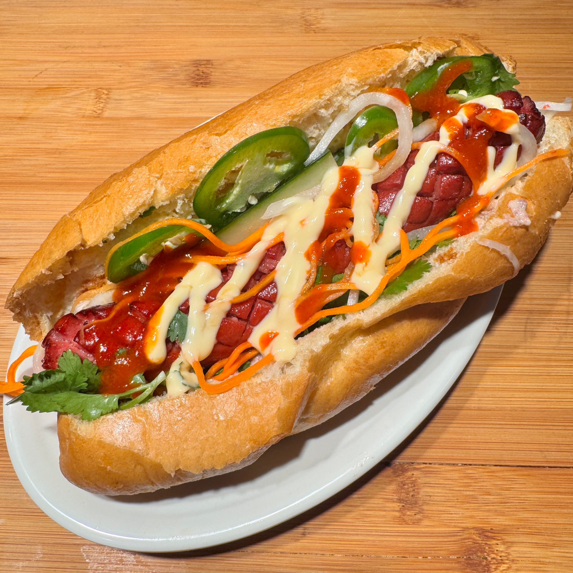 It would be hard for me to get the meat exactly right; they used a traditional combination chả lụa sausage, ground pork and pâté that I could go mad trying to procure here in Kentucky. Instead, I'd steer into heresy, grilling up some slot-cut hot dogs and surrounding them with all the accoutrements of my long-lost sandwich love.